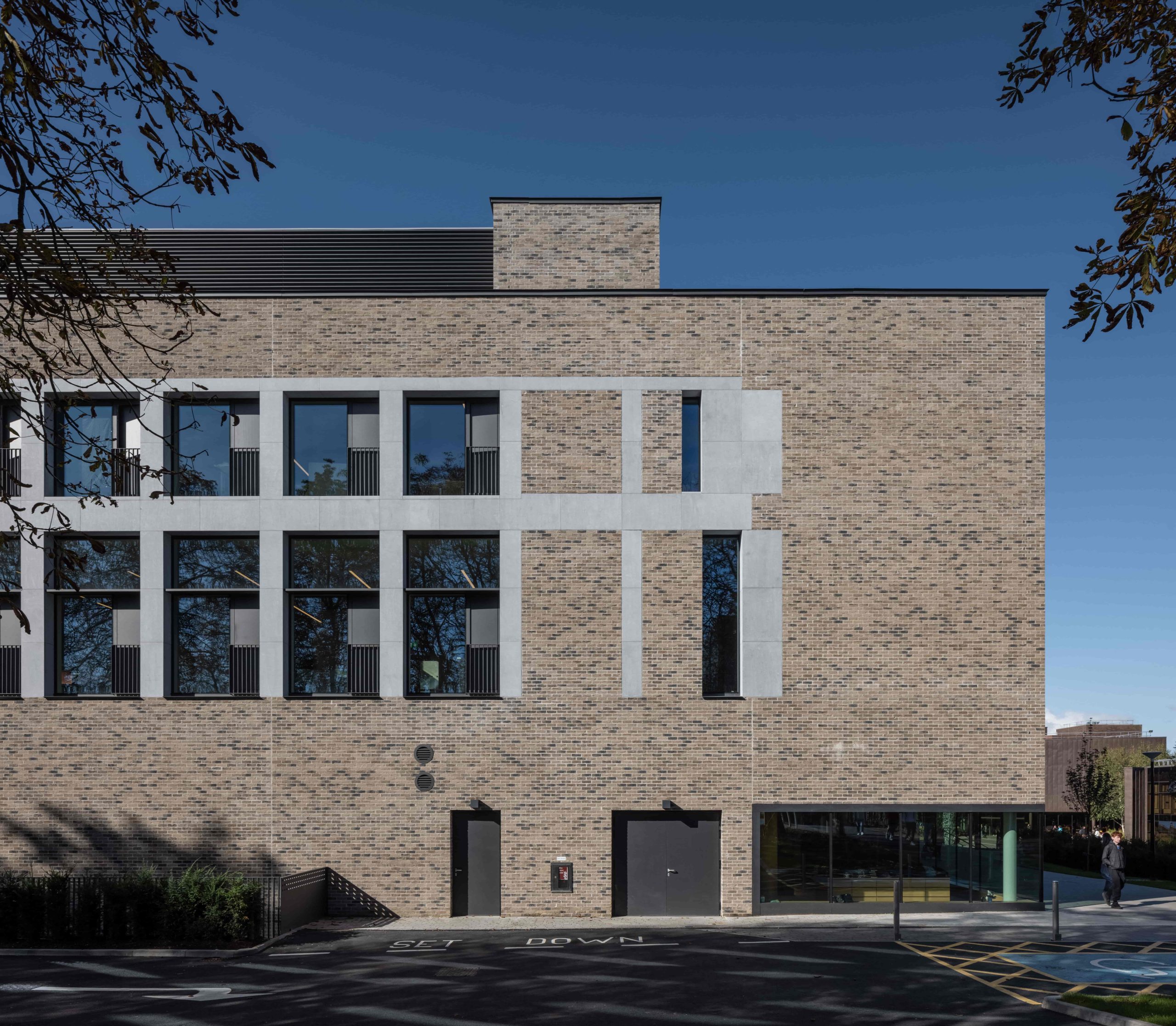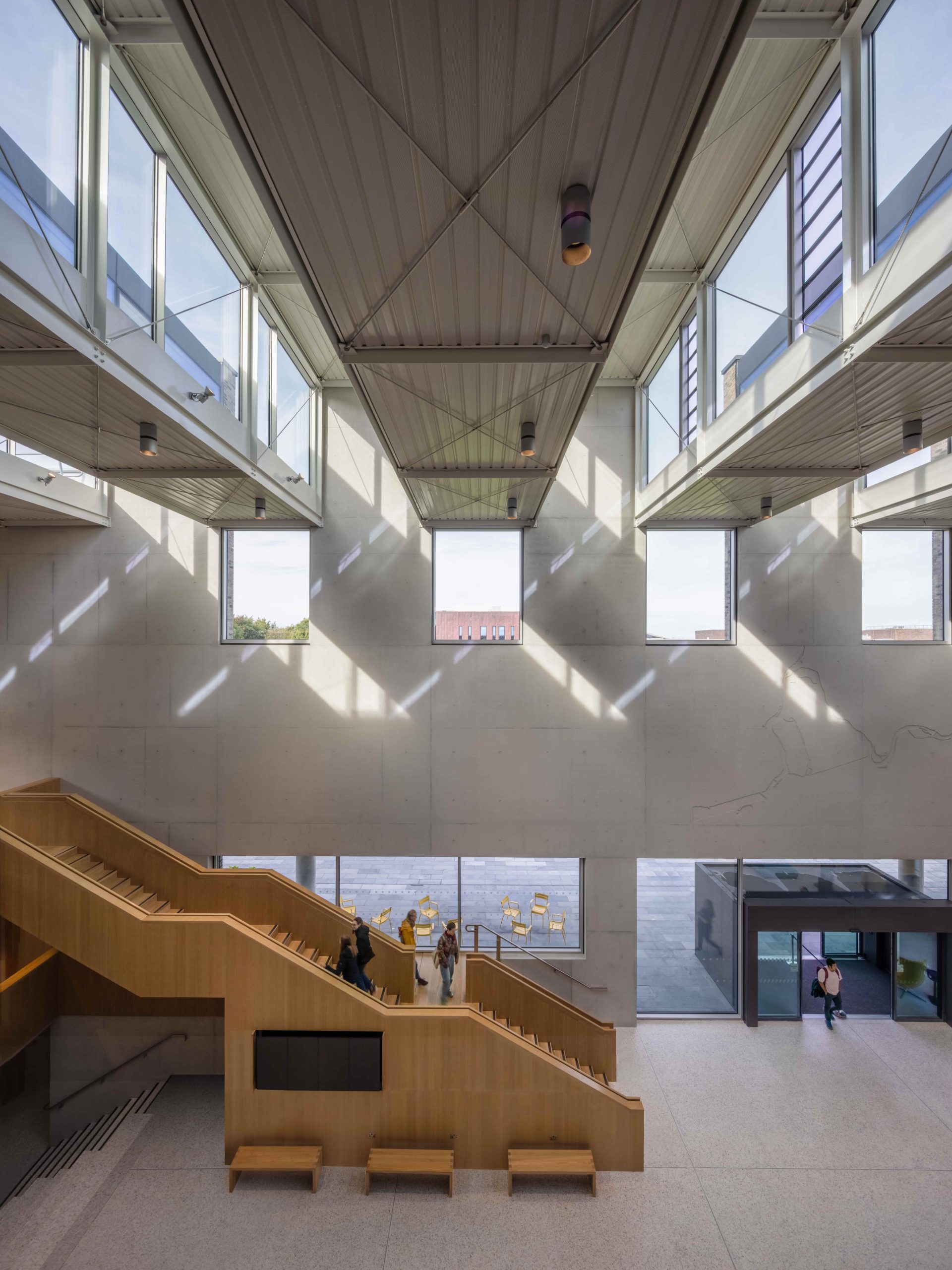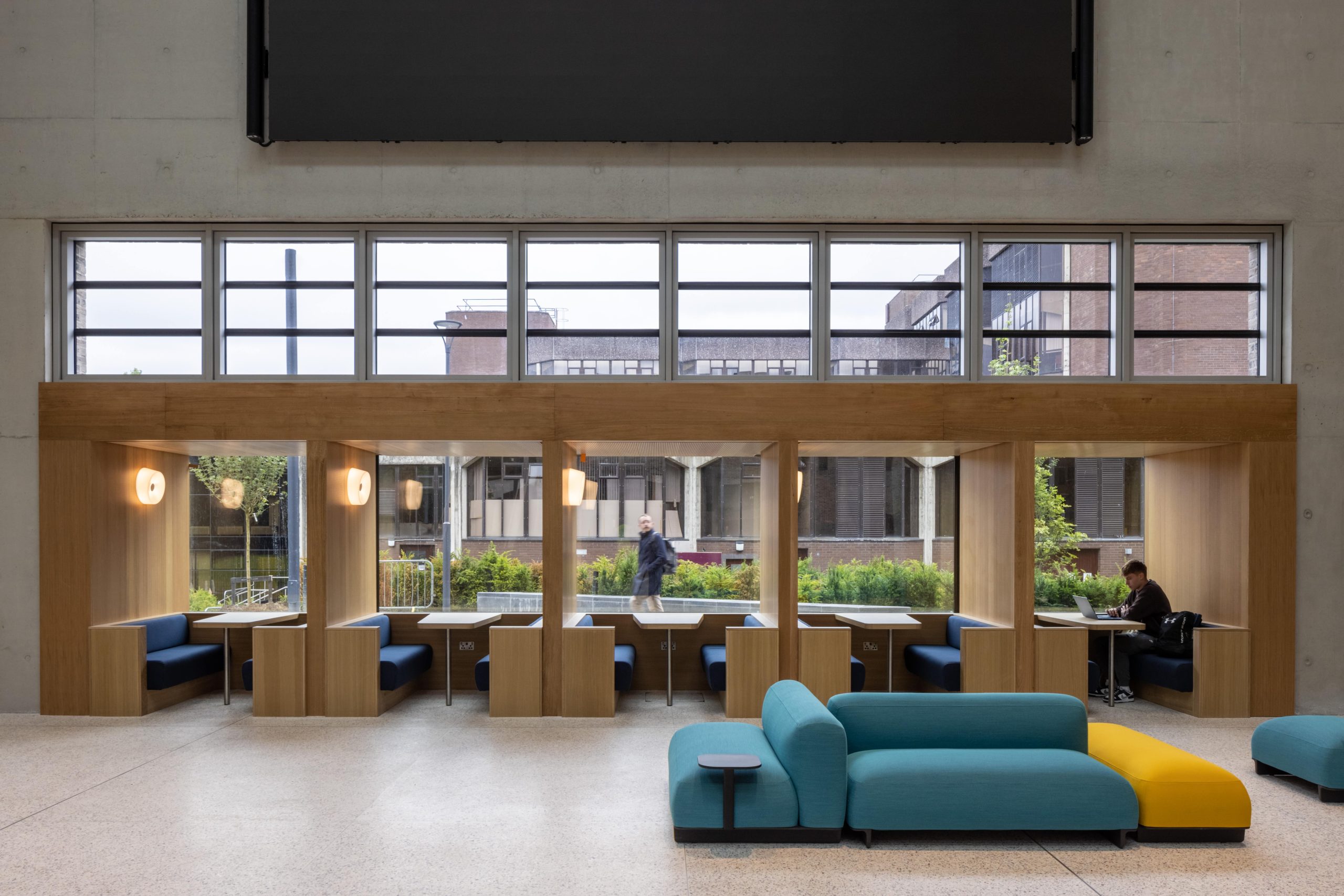 The rectangular building form is considered as a block out of which are carved rooms and spaces that are enclosed or open to the sky as gardens. The section too can be divided into large volume spaces-the foyer, auditorium and a rooftop garden with rooflights bringing light and air into the plan and smaller rooms providing workspaces, clubs and meeting rooms. This sectional logic is carried through in the organisation of the plan- large volumes to the west, cellular spaces to the east. The structure is comprised of a reinforced concrete shell which is left exposed or overclad in oak linings for acoustic modulation. A series of steel framed trusses form clerestory glazing which includes automated glass louvres for natural and smoke ventilation. The robust brick skin of the building envelope is in line with the brick materiality of the campus, however the brick is modulated with limestone slabs that define the openings. A simple material palette provides a calm visual environment. The character of visual, spatial and acoustic experience is controlled. The building becomes progressively more tranquil as one moves around and up the building, The Students Union were very keen on supporting neurodiverse students and creating calm spaces for them. There are many small booths and intimately scaled spaces as well as the voluminous and busy foyer.