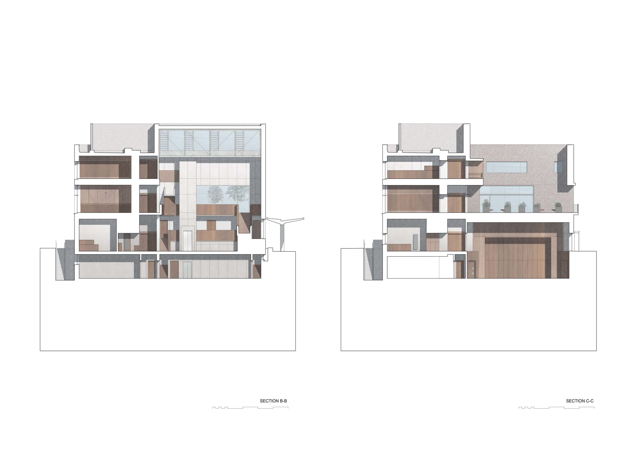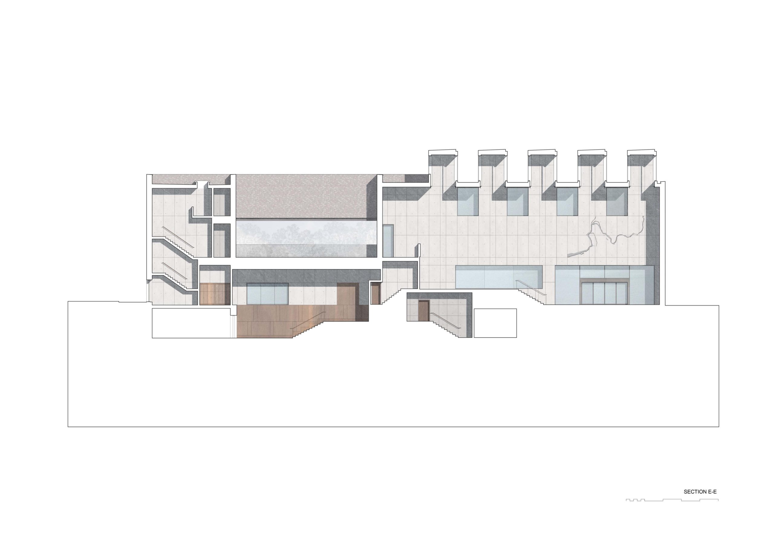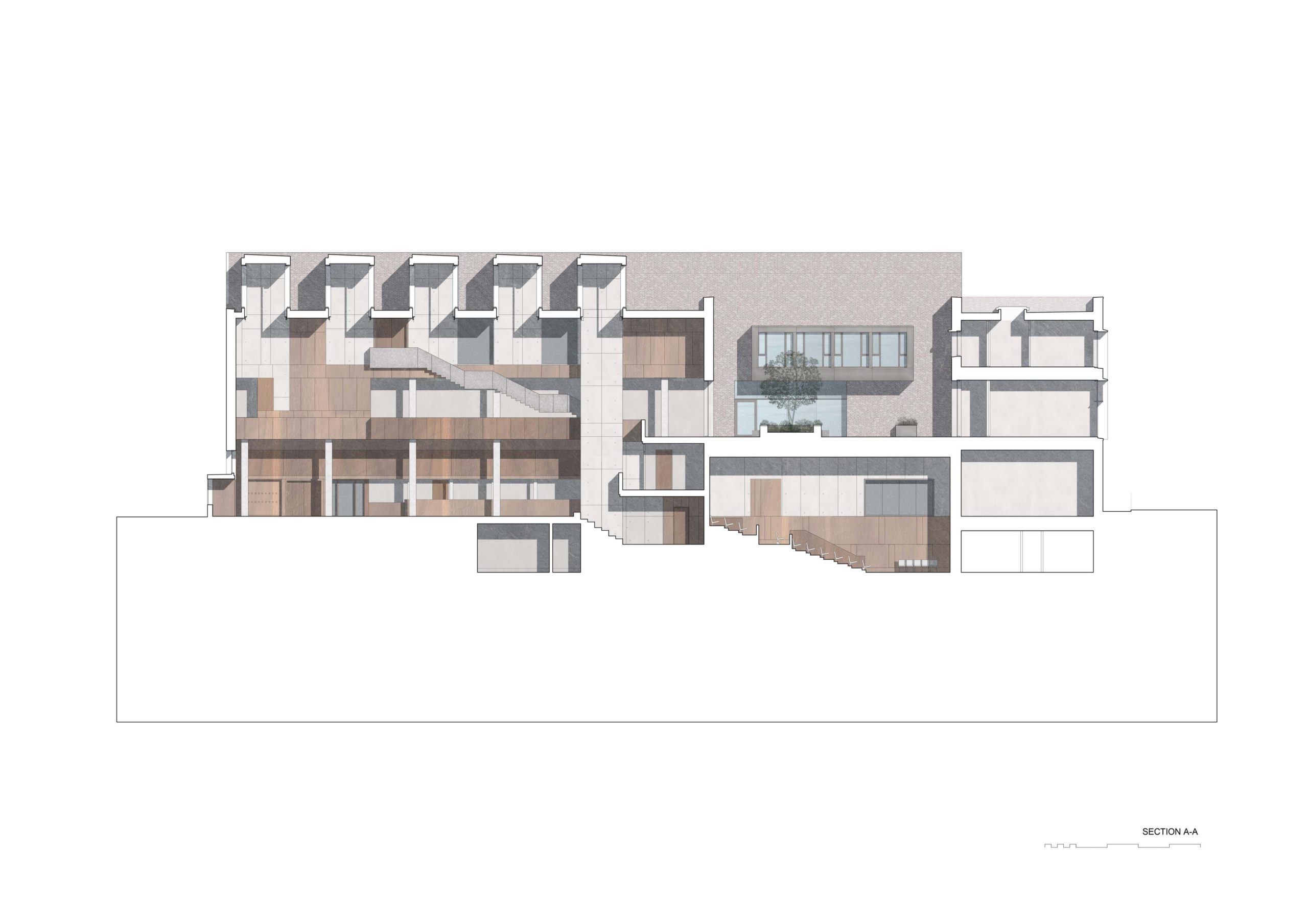 The rectangular building form is considered as a block out of which are carved rooms and spaces that are enclosed or open to the sky as gardens. The section too can be divided into large volume spaces-the foyer, auditorium and a rooftop garden with rooflights bringing light and air into the plan and smaller rooms providing workspaces, clubs and meeting rooms. This sectional logic is carried through in the organisation of the plan- large volumes to the west, cellular spaces to the east. The structure is comprised of a reinforced concrete shell which is left exposed or overclad in oak linings for acoustic modulation. A series of steel framed trusses form clerestory glazing which includes automated glass louvres for natural and smoke ventilation. The robust brick skin of the building envelope is in line with the brick materiality of the campus, however the brick is modulated with limestone slabs that define the openings. A simple material palette provides a calm visual environment. The character of visual, spatial and acoustic experience is controlled. The building becomes progressively more tranquil as one moves around and up the building, The Students Union were very keen on supporting neurodiverse students and creating calm spaces for them. There are many small booths and intimately scaled spaces as well as the voluminous and busy foyer.
